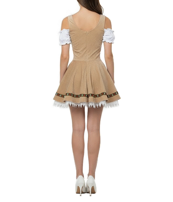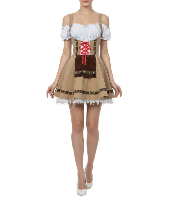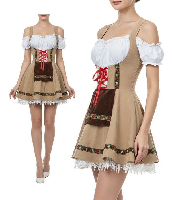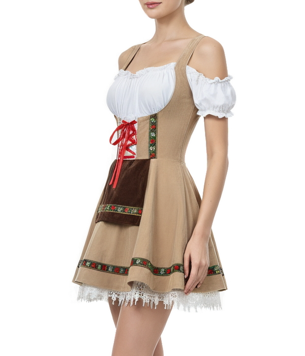 Агентство "Весна прокат" предлагает взять в аренду традиционное платье девушки Октоберфеста. Этот женский баварский костюм вдохновлен классическим дирндлем: светло-бежевое платье с контрастной корсетной шнуровкой спереди, белой блузой с открытыми плечами и пышной юбкой с кружевной оборкой. Декоративная тесьма с традиционным орнаментом и акцентные вставки создают аутентичный тирольский образ, идеально подходящий для Oktoberfest, тематических вечеринок и презентаций брендов.