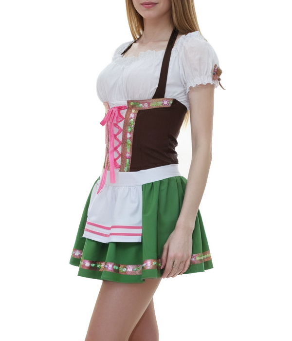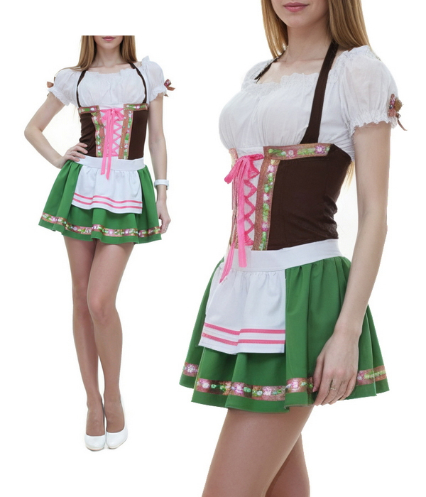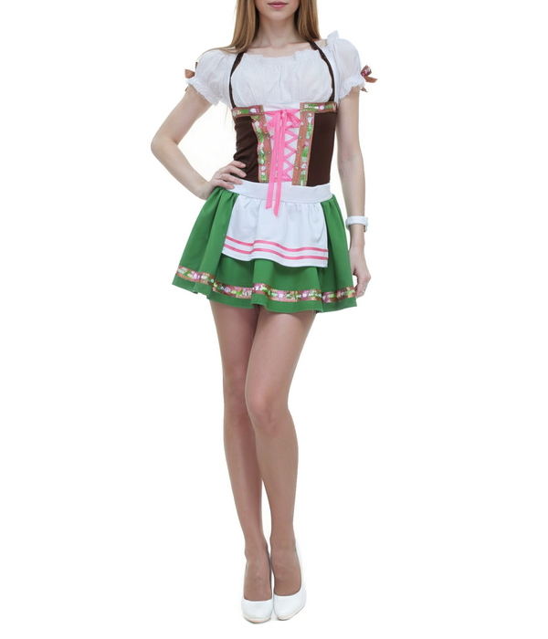 Агентство "Весна прокат" предлагает взять в аренду традиционный баварский костюм зеленого цвета с короткой юбкой. Верх наряда удачно подчеркивает женский бюст, а резинка в области талии выделяет изящные форму девушек. Костюмы официантки в немецком стиле пользуются популярностью у наших заказчиках на выставках, пивных вечеринках и фестивалях в стиле Октоберфеста.