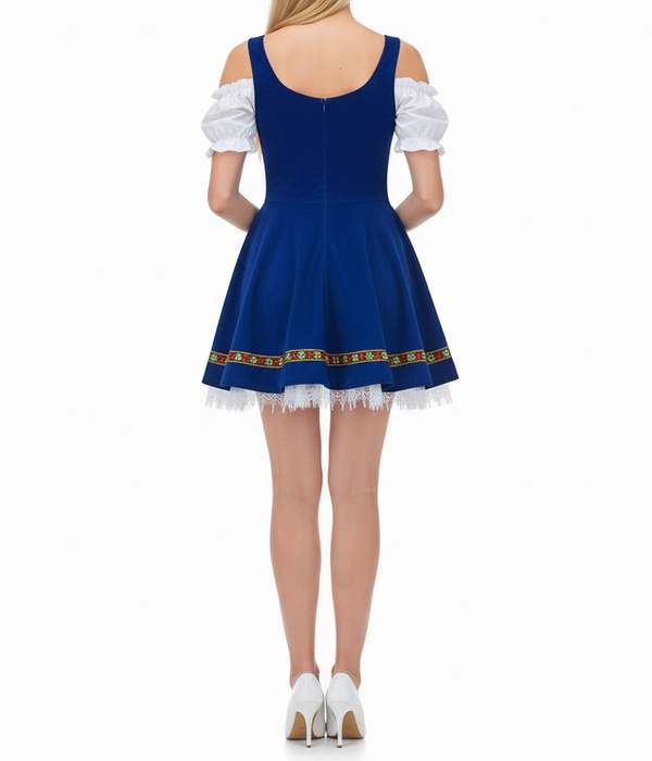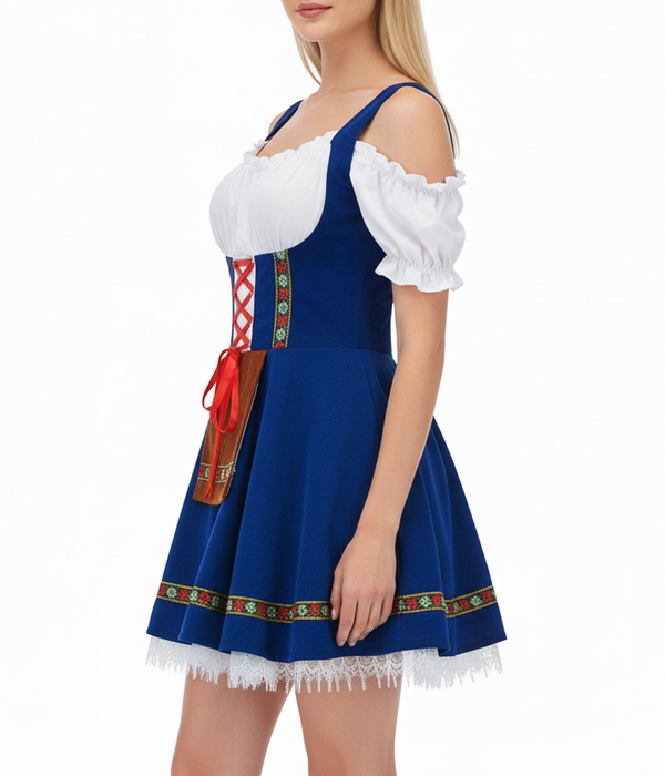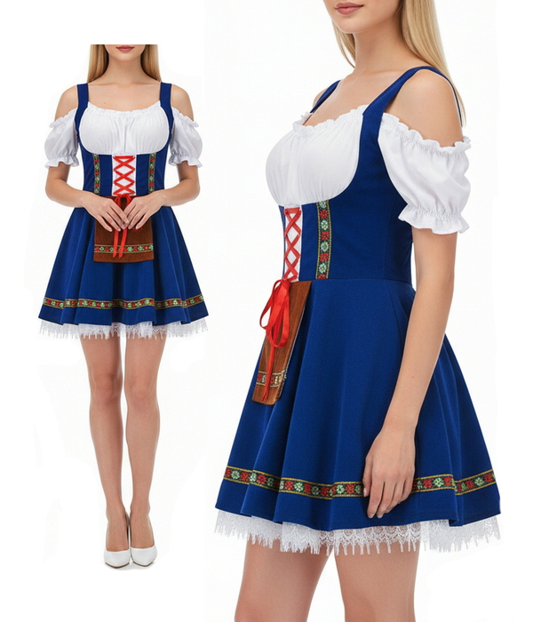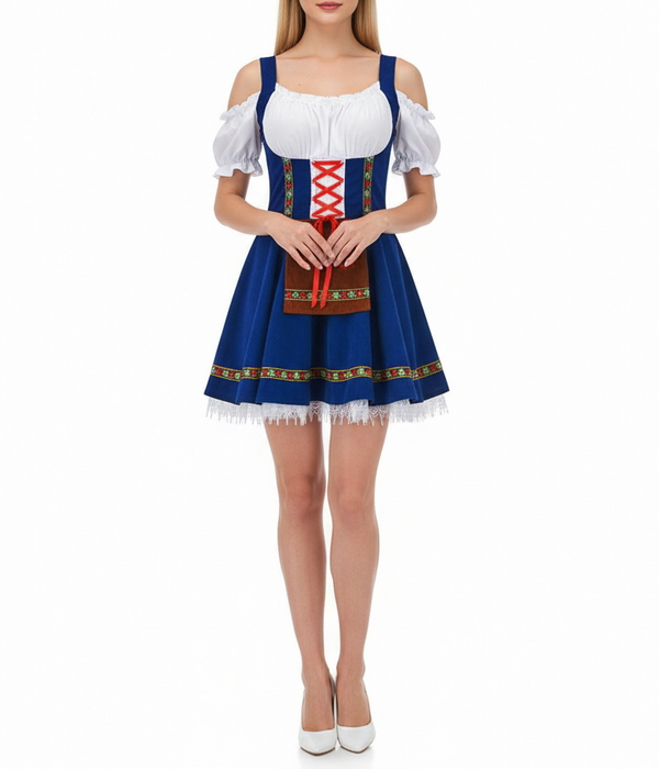Стильный баварский костюм в духе Октоберфеста: приталенное платье-дирндль с белой открытой блузой на резинках, контрастной корсетной шнуровкой спереди и пышной расклёшенной мини юбкой. Насыщенно-синий цвет подчеркнут этнической тесьмой с народными орнаментами, низ украшен кружевной отделкой. Спереди декоративная имитация фартука с акцентной лентой. Образ получается женственным, фотогеничным и идеально подходит как немецкий народный костюм для пивного фестиваля, баварской вечеринки и тематических мероприятий.