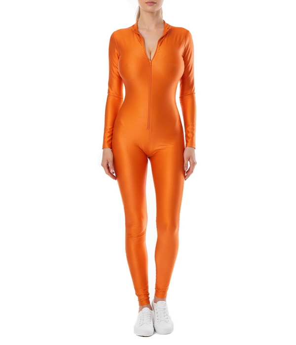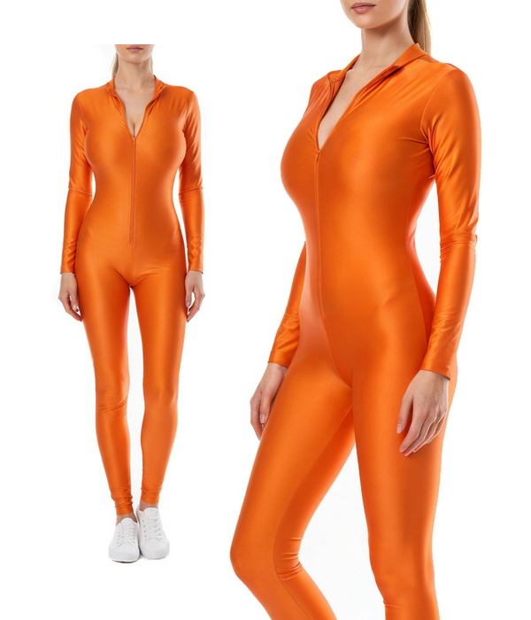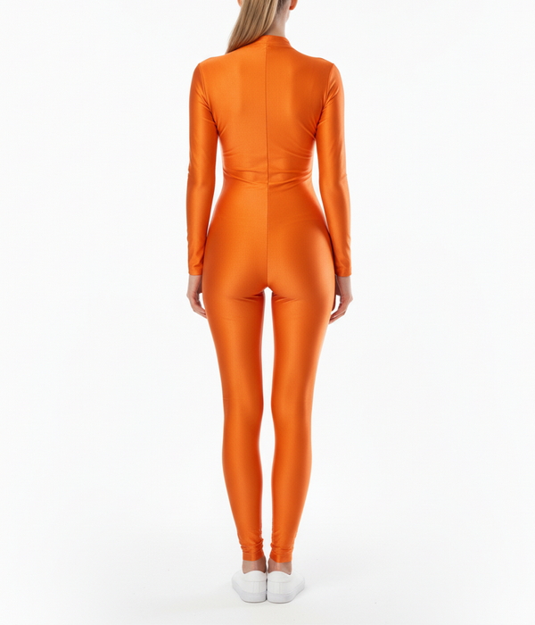 Агентство "Весна прокат" предлагает арендовать облегающий оранжевый комбинезон из эластичной ткани бифлекс с лёгким глянцем. Модель плотно садится, подчёркивает силуэт и удобна в движении. Подходит для хостес и промо-персонала, когда нужен заметный образ на презентациях, промоакциях и фотосессиях.