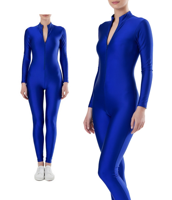 Агентство "Весна прокат" предлагает арендовать ярко-синий облегающий комбинезон с длинным рукавом и молнией спереди. Гладкий стрейч подчеркивает силуэт, воротник-стойка выглядит аккуратно и современно. Костюм удобен для девушек моделей, стендисток, промоутеров и сотрудниц компаний на корпоративы, праздники, презентации бренда и работу на выставках. Прокат промо костюмов, аренда деловых образов, единый дресс-код.