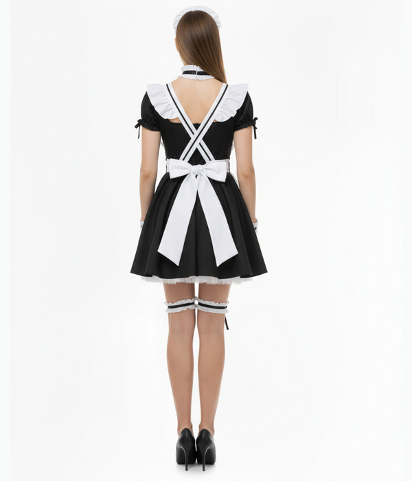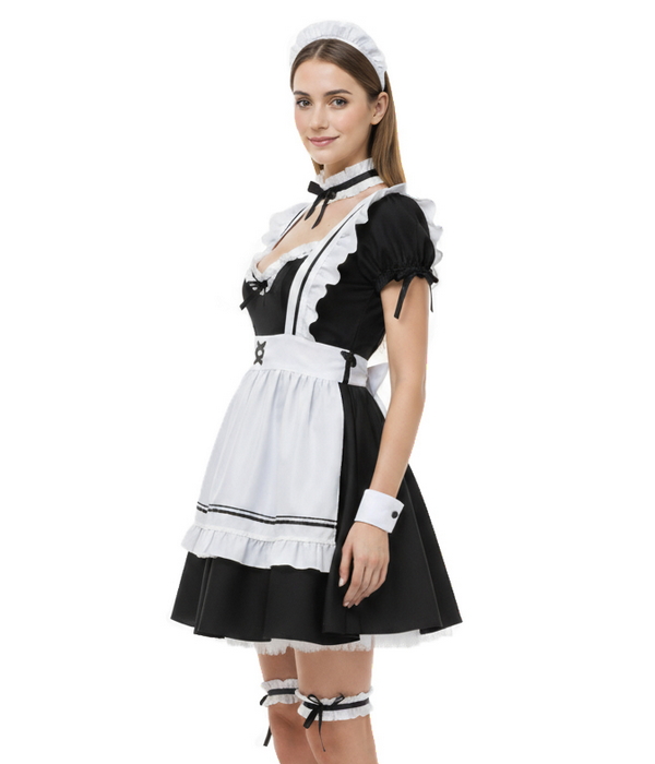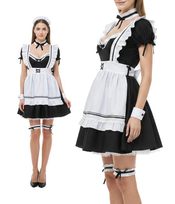 Агентство "Весна прокат" предлагает арендовать чёрно-белый костюм горничной в классическом стиле. Платье с рукавами-фонариками, белым передником с рюшами и контрастной отделкой, кружевной чепчик-ободок, съёмные манжеты и подвязки с бантиками создают узнаваемый образ официантки. Под юбку надевается пышный подъюбник белого цвета, который также входит в костюм. Удобная посадка и аккуратный силуэт подходят для промо-персонала и хостес.
