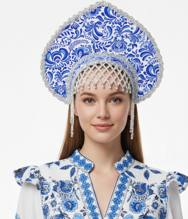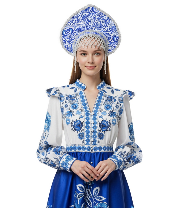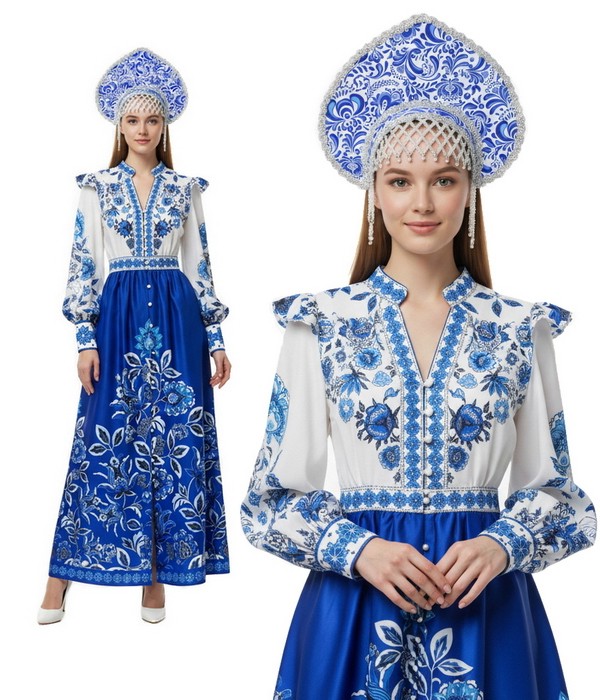 Костюм русской красавицы Гжель: длинное платье с расклешенной юбкой и пышными рукавами плюс высокий кокошник. Бело-синий орнамент в стиле гжель создает яркий русский образ для праздников и сцены. Предлагаем прокат и аренду этого народного костюма для девушек моделей, стендисток, промоутеров и сотрудников компаний для корпоративов и праздников, а также для работы на выставках и презентациях.
