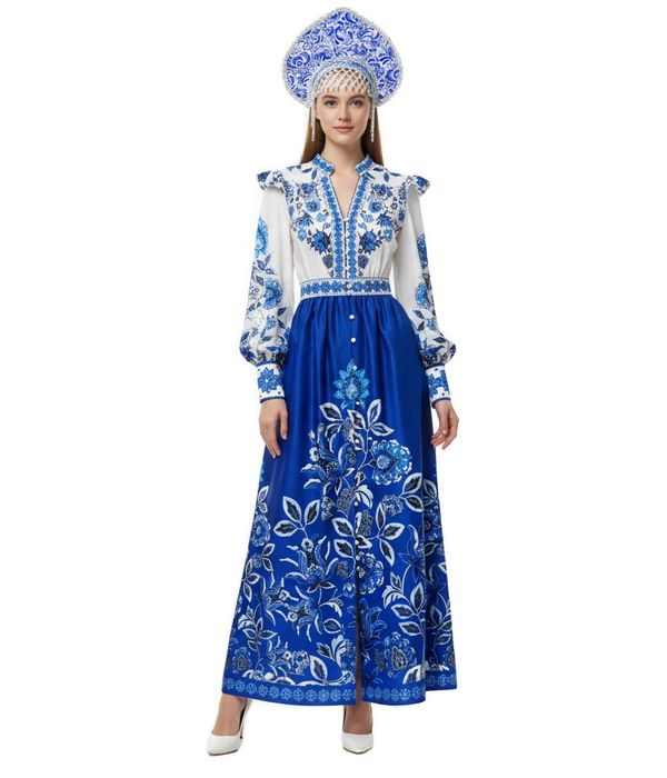 Русский народный костюм синего цвета в стиле Гжель длинный