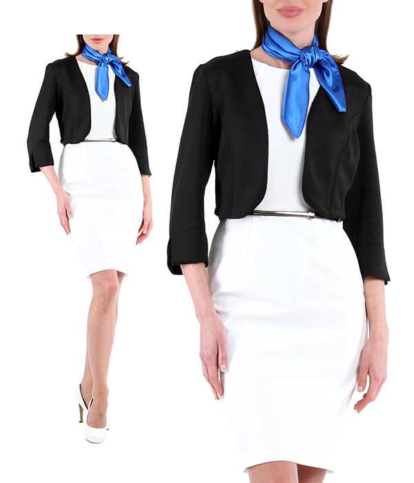 Платье-футляр белого цвета с черным пиджаком и синим платком подходит для аренды на мероприятия: