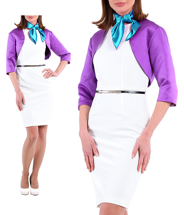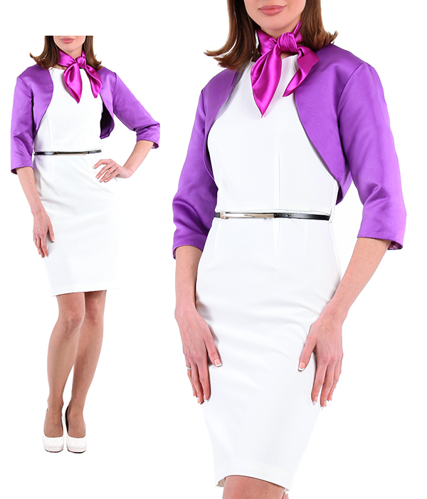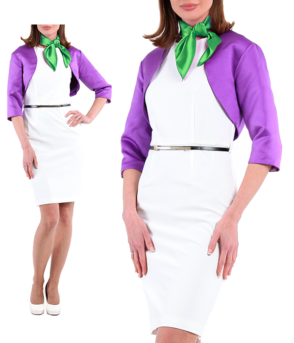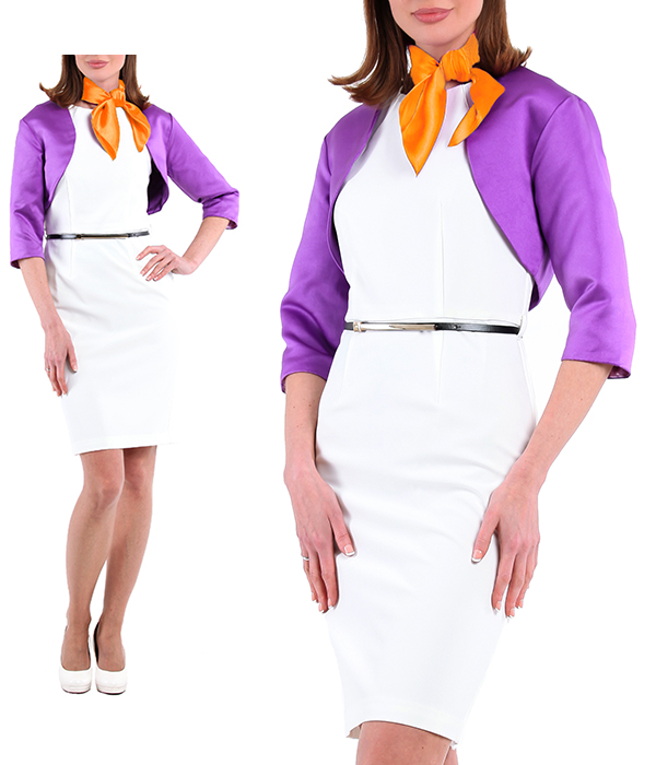 Агентство "Весна прокат" предлагает арендовать костюм состоящий из белого платья-футляра, который подчеркивает фигуру и создает изящный силуэт. Платье дополнено фиолетовым болеро, оно придает образу изысканности и утонченности. Сиреневый платочек на шею добавляет костюму нотку индивидуальности. Этот комплект идеально сочетает в себе классические линии и современные элементы, что делает его универсальным для различных мероприятий и поводов. Используемые материалы высокого качества обеспечивают комфорт и удобство при ношении, а также придают образу роскошный вид.