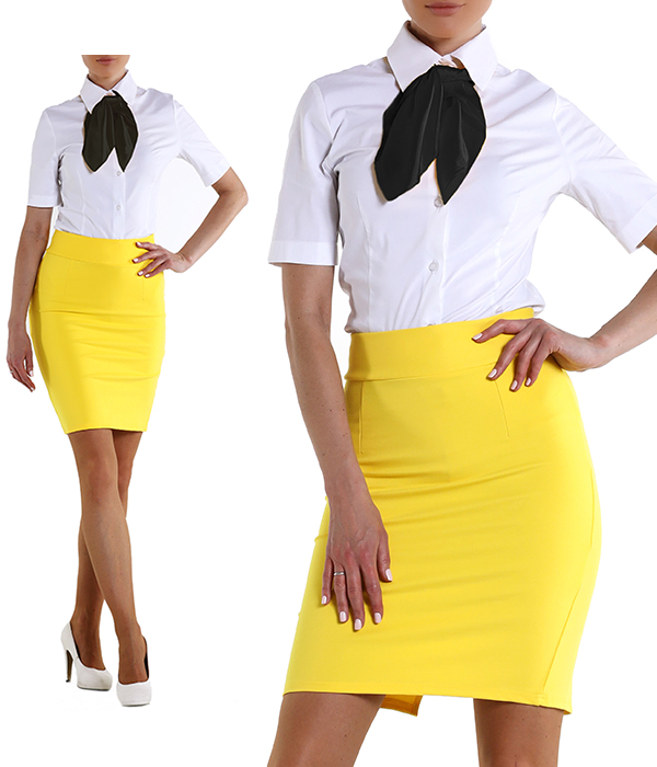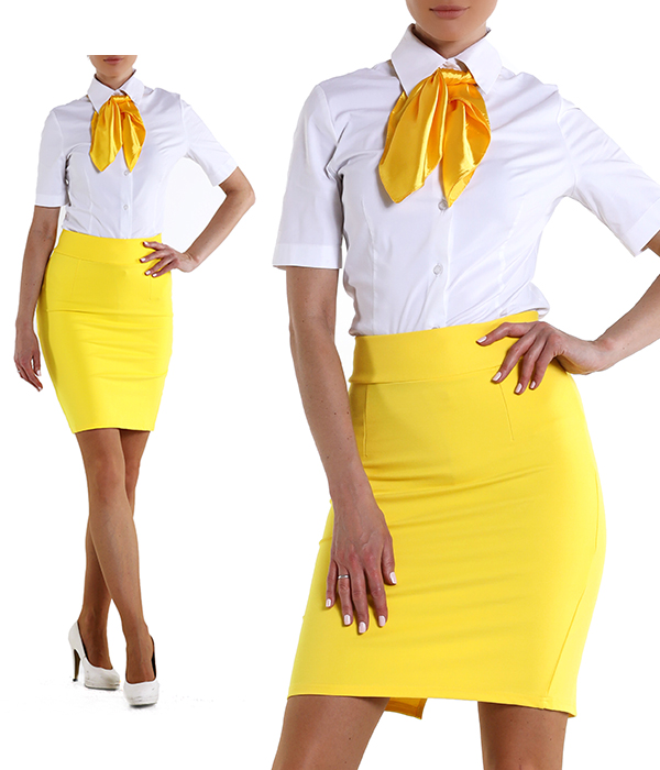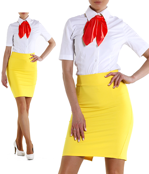 Агентство "Весна прокат" предлагает взять в аренду костюм в деловом стиле, который состоит из юбки желтого цвета длинной до колена, белой блузки и красного платочка. Комплект отличной будет смотреться на девушках стендистках и хостес, которые работают на выставках, презентациях и корпоративных мероприятиях. Одинаково одетый промо персонал привлекает внимание, создает положительный имидж для компании, выделяет сотрудников на фоне общей массы.