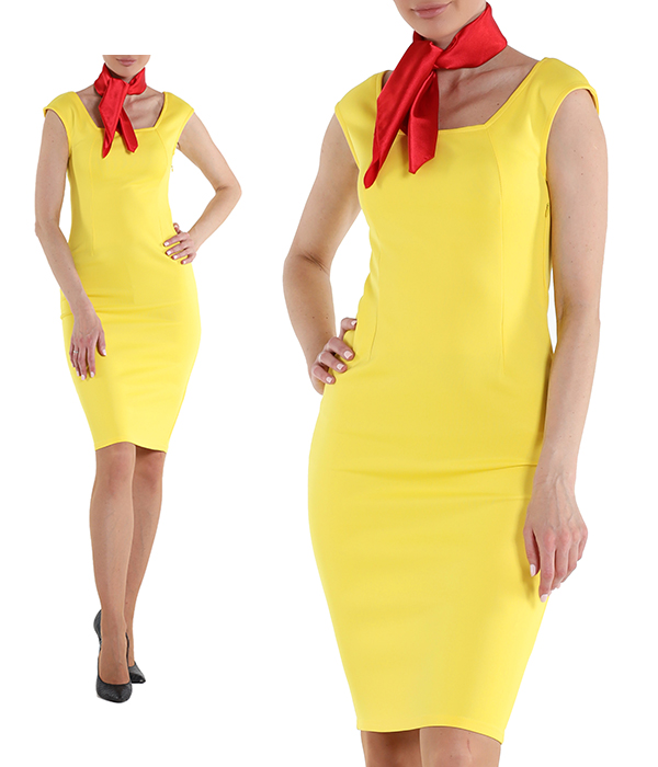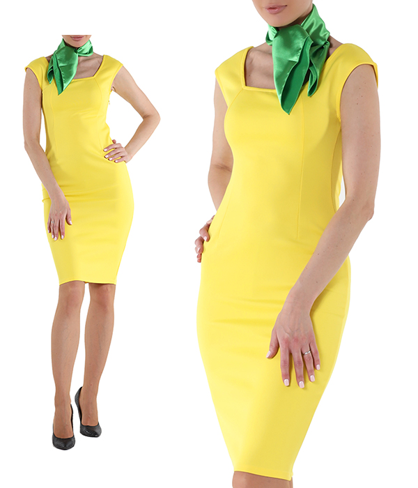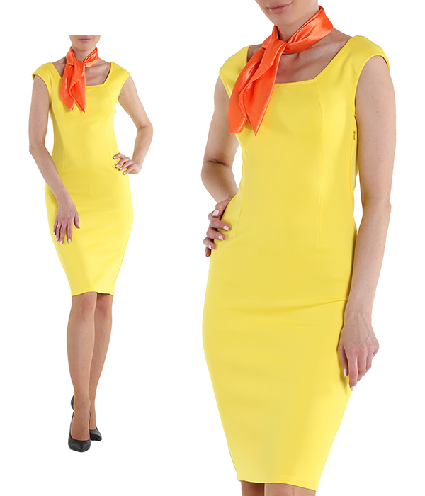 Платье футляр желтое до колена с голубым платочком